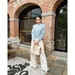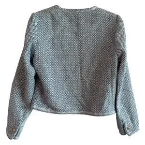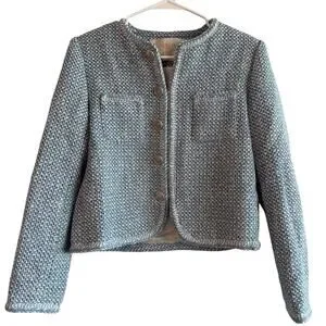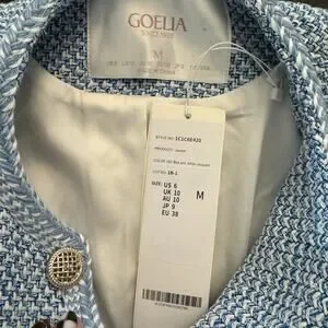 Goelia Tweed Round Neck Jacket in Blue White Jacquard. Size M / Medium. Features round neckline, slightly fitted silhouette, long sleeves with button cuffs, front patch pockets, front button down closure, gold hardware, tweed fabrication. 48% cotton, 26% polyester, 17% acrylic, 8% wool, 1% other fibre. Brand new, never worn, NWT / new with tags.