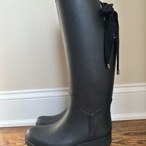 Elegant black knee-high boots with a stylish bow detail. Ideal for winter and rainy days.