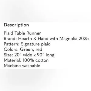 HEARTH & HAND NEW signature plaid table runner -red/green -90x20