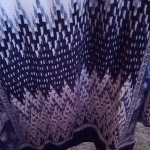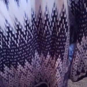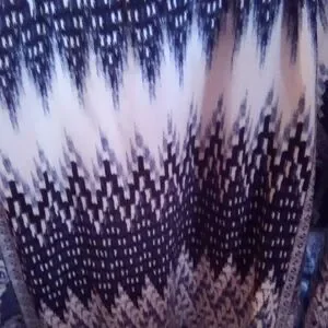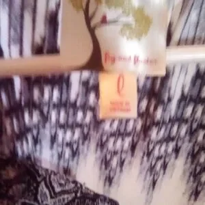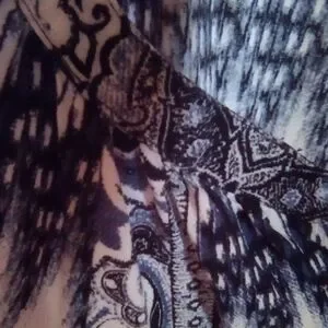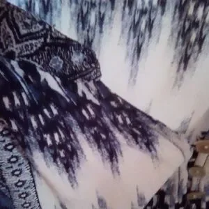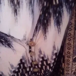 Elegant blouse with navy and cream paisley pattern. Features a button-up front and flowing design.