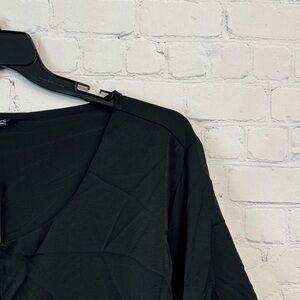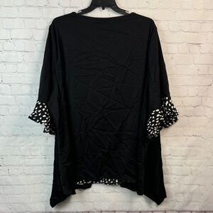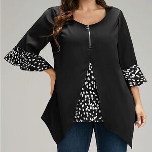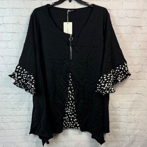 Chic black blouse with unique white patterned accents and zipper detail. Features stylish layered design and flared sleeves. Size 6X (30)
