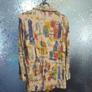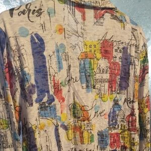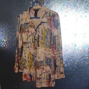 Artsy abstract button up shirt with a beautiful blend of colors.