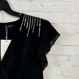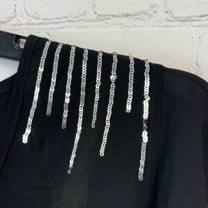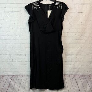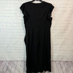 Elegant black midi dress. Features a flattering surplice neck, ruffle sleeves, and silver sequin detailing. Zipper closure at the back. Perfect for any occasion. Size 1X (14/16)