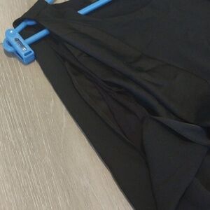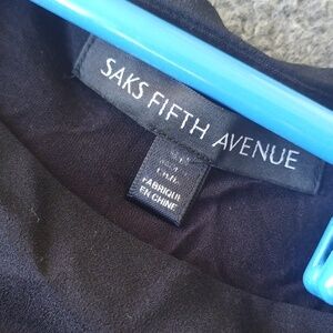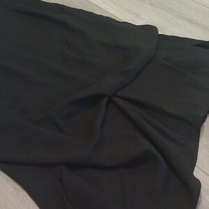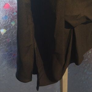 Sleeveless with one side having draped fabric over the shoulder. Cinched in the middle to give it dimension and shape. Sophisticated top. I believe it is a Medium. The tag is worn and hard to tell. It is challenging to capture the real beauty of this top in the photos. Looks very high end. The under shirt, without stretching to full is about 14-15"