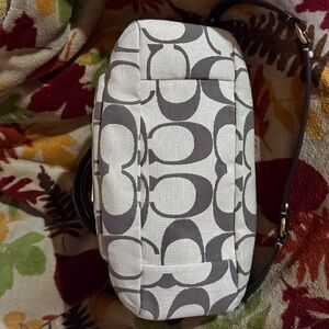 Stylish Coach satchel in brown and cream. Features signature pattern and gold hardware. Ideal for everyday use.