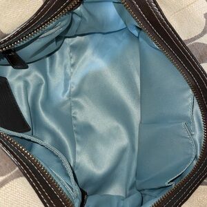 Coach Tan brown signature Kristin Linen satchel L1082-16820 blue satin lining, exterior pocket with flap and coach embossed buckle closure, rolled handles. Bag has also detachable adjustable shoulder strap. Inside, open pocket multi-function interior compartments, zip closure. Brown leather trim, coach tag and brass hardware. Measurements: W 11.5", H 8", W 4" and shoulder drop is 10". New no tags.