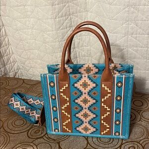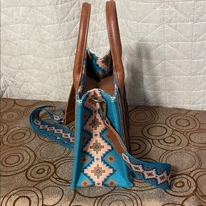 Chic Wrangler tote with a striking teal and tan geometric design. Ideal for everyday style.