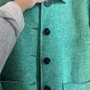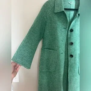 Cozy and stylish vintage-inspired longline coat in a beautiful green houndstooth pattern. Features an oversized minimalist silhouette, large front pockets, button-front closure, and a subtle A-line shape for an elevated, chic look. Made from a warm 80% wool blend, perfect for fall & winter layering.