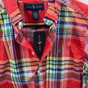 Vibrant plaid design. Button-down style. Boys size 10/12 button down dress shirt. 100% cotton. Perfect for Easter.