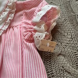 EXCELLENT NWT condition pink Hi Girls Inc. America Made vintage girls dress. Zero flaws and in amazing condition. Gorgeous pink tone with white stripes. Details include a Peter Pan collar that is embroidered with adorable floral scene. This piece is trimmed with gorgeous white eyelet fabric and topped off with crisp delicate pleats.