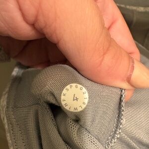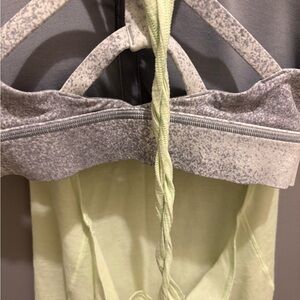 Lululemon twist & toil tank top with built in bra. Shirt is a light green color. Bra is a gray color with white design.