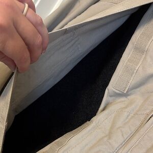 **has one small tear pictured and numerous small stains from being worn outside, could come out easily with a spot remover, still has A lot of life left in it and is heavy duty with pockets galore for all your ammo and small fire arms