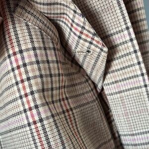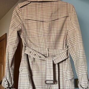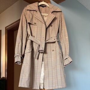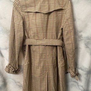 Stylish plaid trench coat. Double-breasted design. Belted waist. Classic and versatile. Pit to pit 18”, shoulder to hem 36”. Button missing from front left pocket as seen in photo, spare button located inside by right lapel.