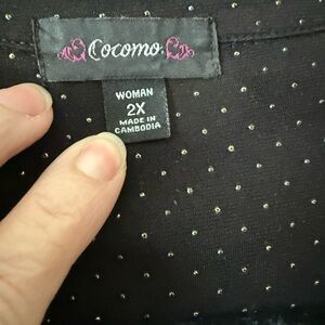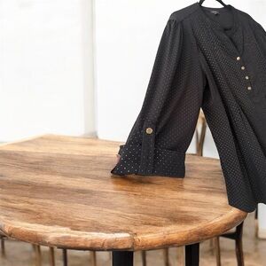 Chic black blouse with button-up front. Features subtle dot pattern. Ideal for versatile styling. PTP 27 Length 31