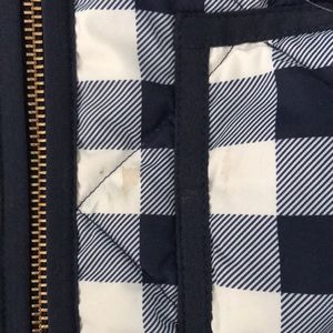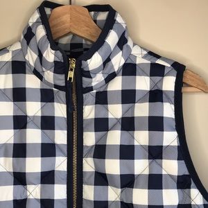 J. Crew brand down puffer zipper vest. Classic plaid print in navy blue and white buffalo check. Two large front pockets!