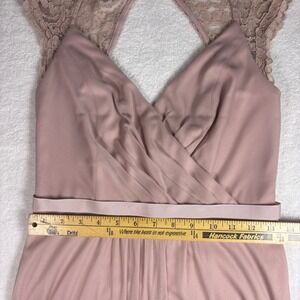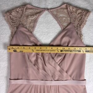 Davids Bridal mauve pink formal gown with delicate lace cap sleeves and a flattering V-neckline. The dress features a criss-cross bodice detail and a chic keyhole back with a button closure. A satin ribbon waistband cinches the waist, flowing into a gracefully gathered chiffon skirt. A hidden zipper closure is located at the back.