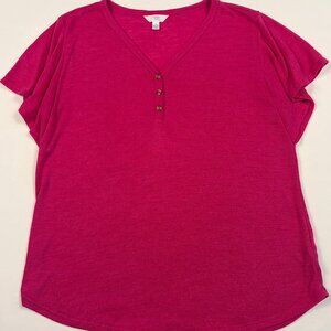 This short-flutter-sleeve, knit top with button neckline is a pretty fushia pink is in like-new condition. The hemline is slightly rounded for a flattering fit and the fabric washes well. This vesatile top will pair with jeans, shorts, skirts, and pants, and can easily be elevated with a jacket or blazer.