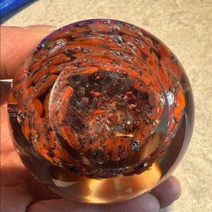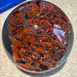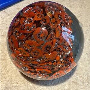 Add a pop of color to your desk or glass collection with this beautiful handmade millefiori paperweight. This piece features a dense "scramble" or "close-pack" design of vibrant orange-red canes with white and black star-shaped centers.