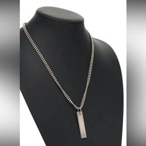 The Gucci dog tag or bar pendant necklace, crafted from sterling silver. These necklaces typically feature a sleek silver chain and a rectangular pendant with branding or a logo engraving, often with the interlocking G design.