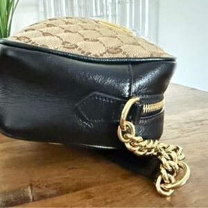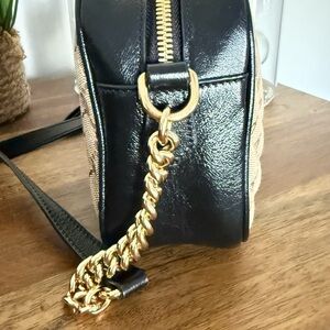 Elevate your style with this Gucci crossbody bag. Featuring a chic beige and black design, this bag is perfect for any occasion. The gold chain adds a touch of luxury.