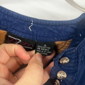 This vintage women's boho henley top in blue features a stylish pop over design with long sleeves and a unique henley neckline. The small size makes it a versatile piece for women looking to add a touch of bohemian flair to their wardrobe. The long sleeves and henley neckline offer a classic yet trendy look, making it a perfect choice for casual outings or a night out with friends. The blue print adds a fun and pop of color to any outfit, making it a must-have piece for any fashionable woman's collection.