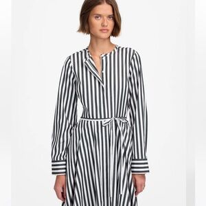 Crafted of 100 percent striped cotton, this collarless shirtdress is fitted at the waist with inverted pleats to create a fuller skirt. Wear the self tie cinched for a tailored look or untied for a relaxed vibe.