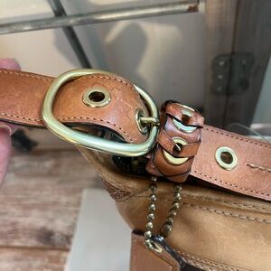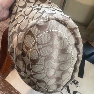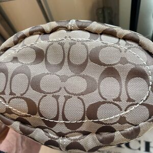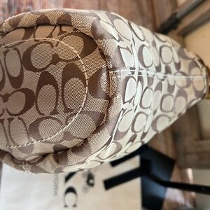 Stylish Coach shoulder bag with signature pattern. Features tan and brown tones. Perfect for everyday use.