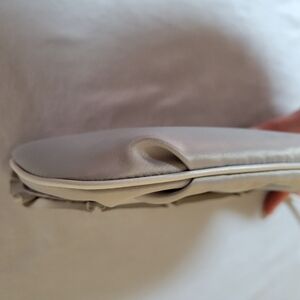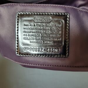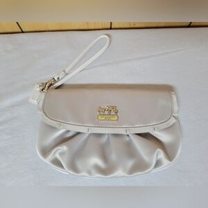 Chic Coach wristlet in metallic silver. Features a sleek design with a wrist strap. Perfect for evening outings.