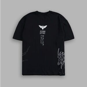Black tee with striking graphic. Features bold artwork. Ideal for casual outings.