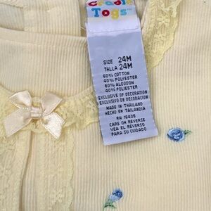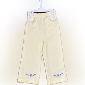 Yellow two-piece baby outfit with collared lace trim. A very unique set with beautiful embroidered blue floral accents. Features 2 button closure, elastic waist band pants with lace trim and long sleeves with lace trim. This outfit will make a wonderful addition to your little girl’s wardrobe!