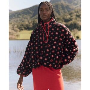 The Great.'s Countryside Pullover is a charming, hip-length fleece jacket boasting a relaxed silhouette and a whimsical, all-over floral print. The soft, plush sherpa fabric offers a cozy feel, making it perfect for layering on chilly days. The subtle red accents at the collar and hem add a touch of unexpected color, creating a unique piece that effortlessly blends comfort and style, suitable for weekend brunches or a casual stroll through the countryside.