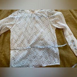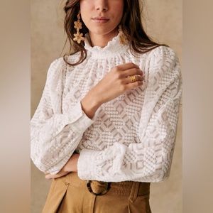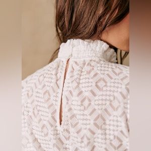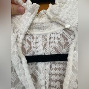 Elegant white lace top. Features intricate patterns. High neckline and long sleeves. Perfect for a chic look.