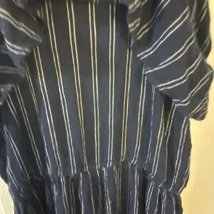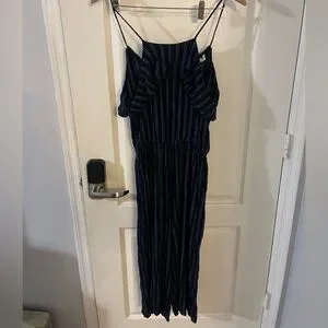 Stylish jumpsuit with vertical stripes. Features a V-neck and adjustable straps.