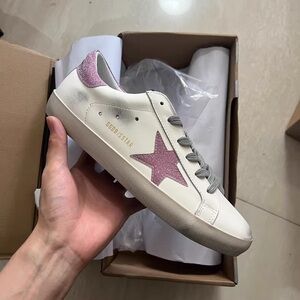 Golden Goose sneakers with a white base and pink glitter star. Stylish and comfortable for any casual outing.