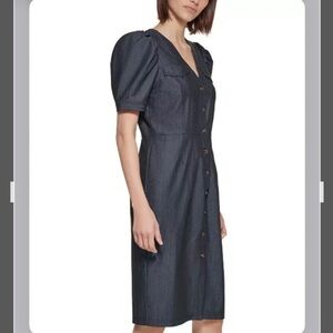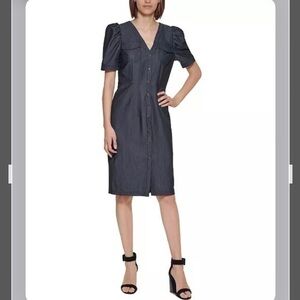 New with tag. Denim dresses up with puff sleeves, flap pockets and tailored top-stitching in this streamlined sheath from Calvin Klein.