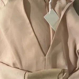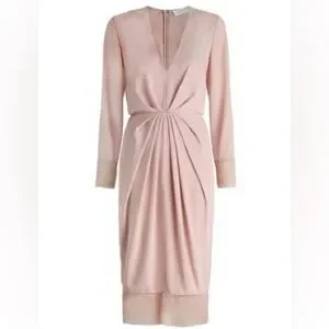 Elegant and feminine Zimmermann dress in a soft dust pink hue, featuring pleated detailing, a flattering V-neckline, and concealed back zip closure.