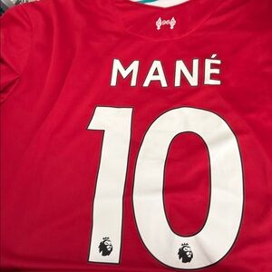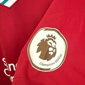 Liverpool FC jersey by Nike. Bold red with white and teal trim. Features team crest and sponsor logo.