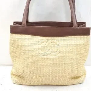 Chanel tote with elegant tan woven design. Rich brown leather handles. Perfect for stylish outings.