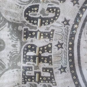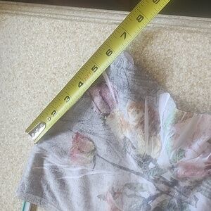 Stylish American Cowgirl tee with floral and graphic design. Rhinestone detail in front. Comfortable fabric. Perfect for casual wear. Scoop Neck in front and Deep V in back, Longer in back with pleated look in center bottom. Gentle Pre-Loved Condition. Dog friendly home.