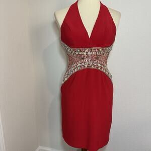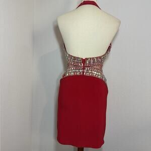 Vintage TONY BOWLS Sequin Cut Out Red Halter Cocktail Dress Pageant HOCO Formal