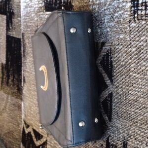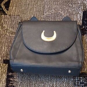 Stylish black clutch size bag, "Luna" from Sailor Moon inspired, little black ears peeking out the top, gold coloured moon symbol, 3 inner pockets (1 zippered), magnetic snap enclosure, leather-like, was a crossbody adjustable bag but the strap came off on one side, can be used as a clutch, strap is included if you're interested in repairing, light wear (especially on moon tips, pictured) but otherwise great condition.