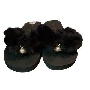 NEW! JUICY COUTURE Fur Pearl/Charm Flip Flops Black Sz 7