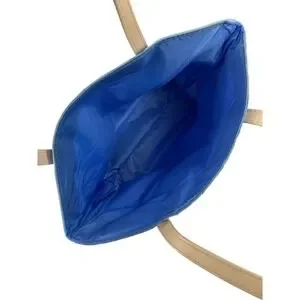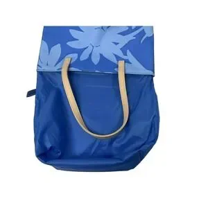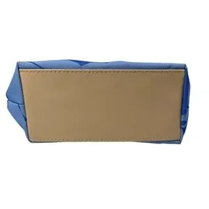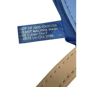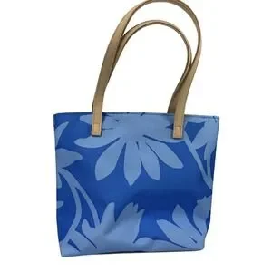 This cute little tote bag is from Estee Lauder. It features a blue on blue floral print with natural colored double handles and bottom. The inside is one compartment and fully lined. It measures approximately 7" x 3 1/4" x 8" - handles add another 5".