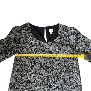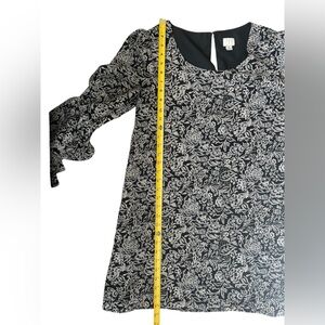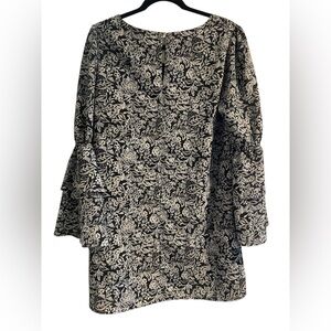 A New Day Women’s Printed Bell Sleeve Shift Dress Black Small. Printed black shift dress with tiered bell sleeves. Scoop neck. Button enclosure in back of dress. In great condition with no visible signs of flaws! See photos for measurements.