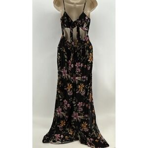 The American Eagle Women's Floral Jumpsuit is a stylish one-piece outfit featuring a vibrant multicolor floral pattern with a V-neck and split leg design. This sleeveless jumpsuit is perfect for a summer wardrobe and includes a tie closure and bow accents for added flair. The wide-leg style and 26-inch inseam make it comfortable and on-trend for any occasion. Made by American Eagle Outfitters, this size medium jumpsuit is a versatile addition to any woman's clothing collection.