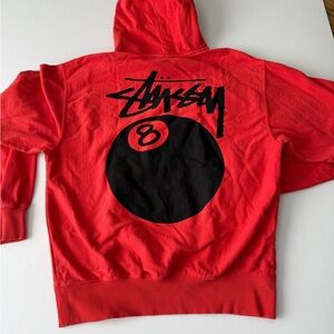 Vibrant orange sweatshirt with bold black 8 ball graphic. Iconic Stussy branding on back.