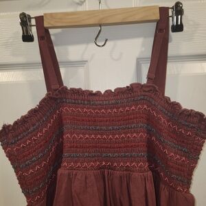 Mauve colored stylish baby doll tank, cinched upper and flowy bottom with blue, pink and red zigzag pattern. Sleeveless design. Perfect for casual wear.