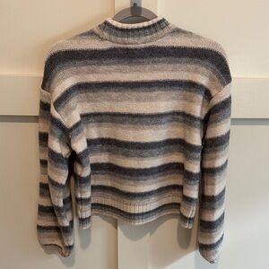 Stay cozy and stylish with this striped gray and cream sweater. Perfect for any casual outing.