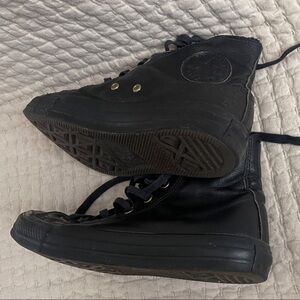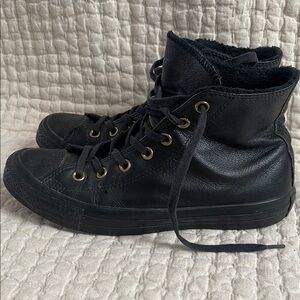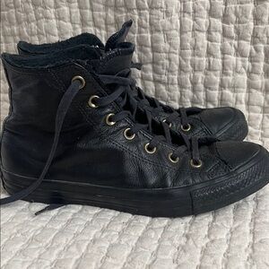 All-black Converse All Star high tops. Gold eyelets, black rubber sole. Genuine leather. Lined with a thin velour to give that extra cozy warmth for fall/winter. Tons of life left in these rad Y2K sneakers. Women’s 8 (US) Men’s 5.5 (US). Actual size is worn off on the original tag, (I am a size 8 and these fit like a glove if that helps!)