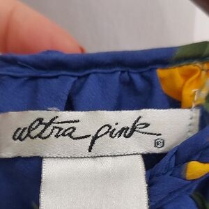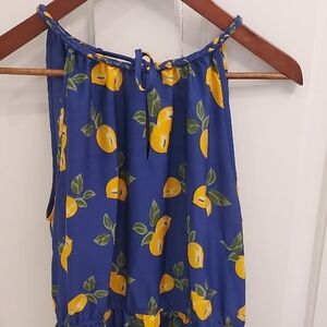 Stylish high low dress by Ultra Pink. Features a vibrant blue base with yellow lemons pattern. Perfect for casual outings.